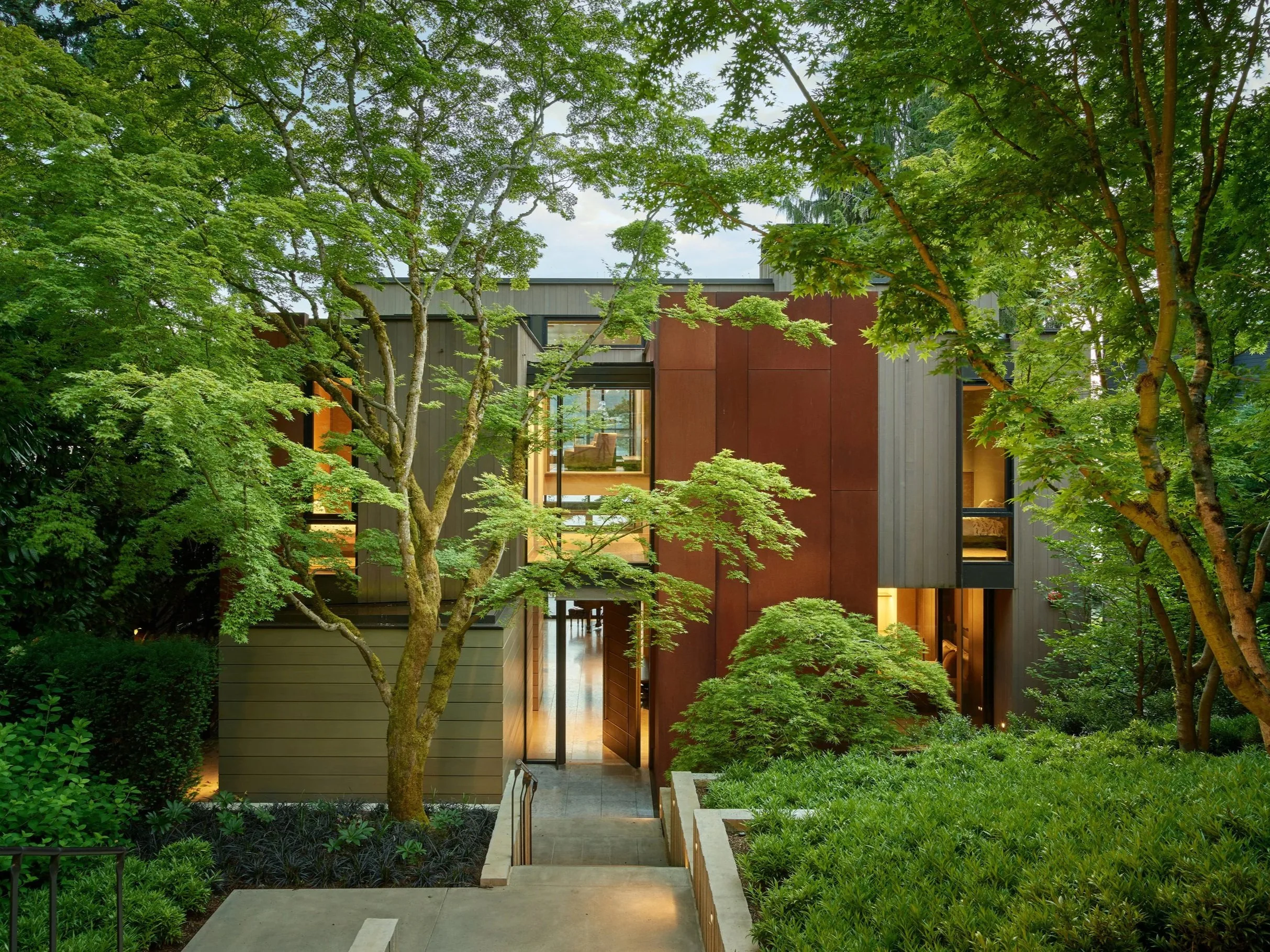 The movement from street to house is conceived as a journey, where work and public life gives way to nature and private reflection. The 60-foot drop from entry drive to water's edge, was not without challenges. The upper driveway becomes a winding forest drive, while the final steps to the house pass through a series of intimate landscapes. Planted roofs merge the house with its setting.