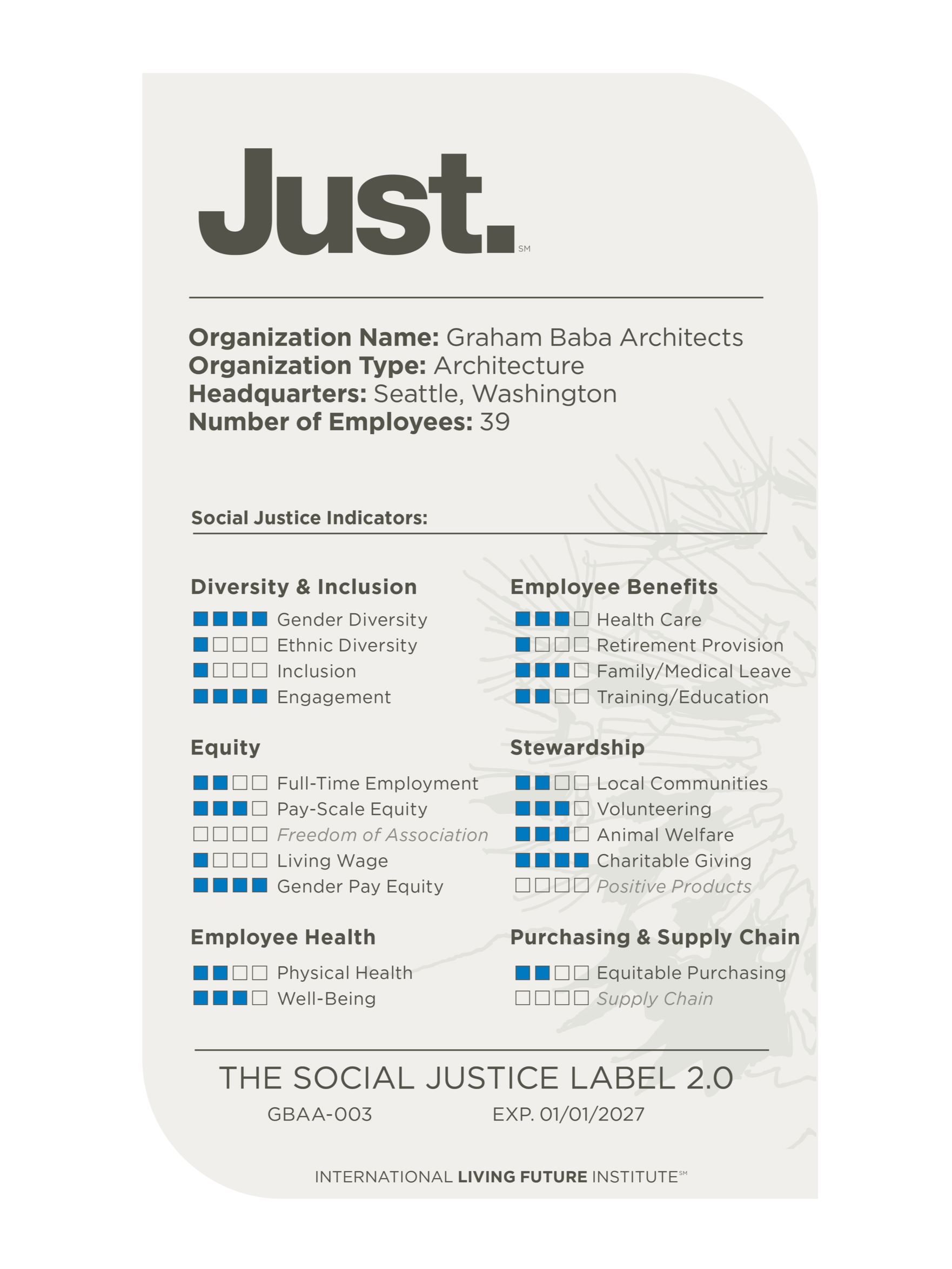 We are committed to social justice and equity transparency. Graham Baba Architects is a JUST 2.0 label holding company with the International Living Future Institute’s disclosure program.