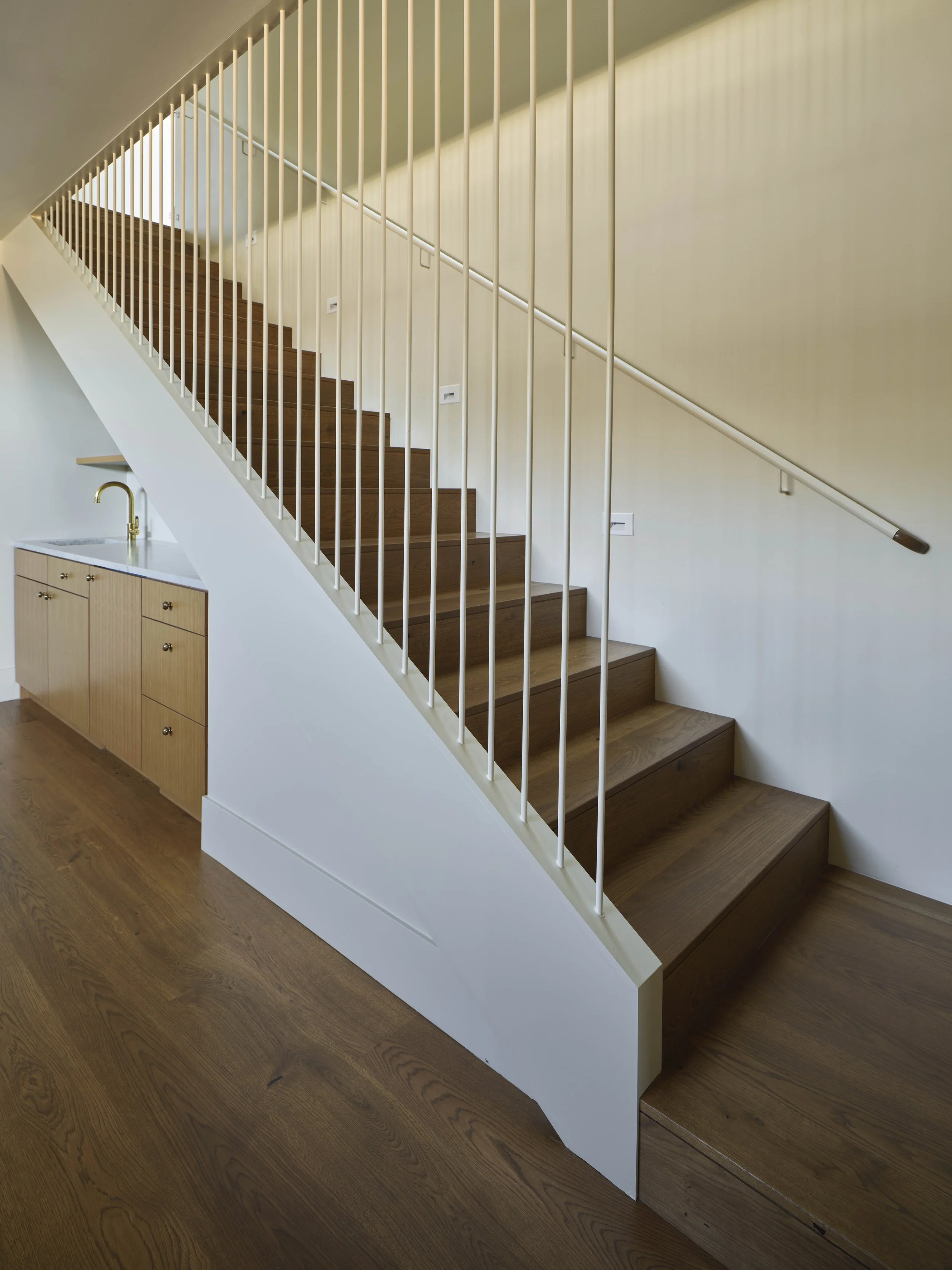 One of the home’s most noticeable exterior features is the central chimney volume, which organizes the main living spaces while serving a pragmatic role: it houses not only the wood-burning fireplace flue, but also all mechanical exhausts, eliminating the need for additional roof penetrations. On the interior, a large skylight together with an open stair brings ample daylight into the lower-level arrival point and den. The stair includes a custom steel guardrail and a bent steel plate detail that subtly increases head height at the lower landing—making the descent feel more gracious without requiring additional excavation for ceiling height.