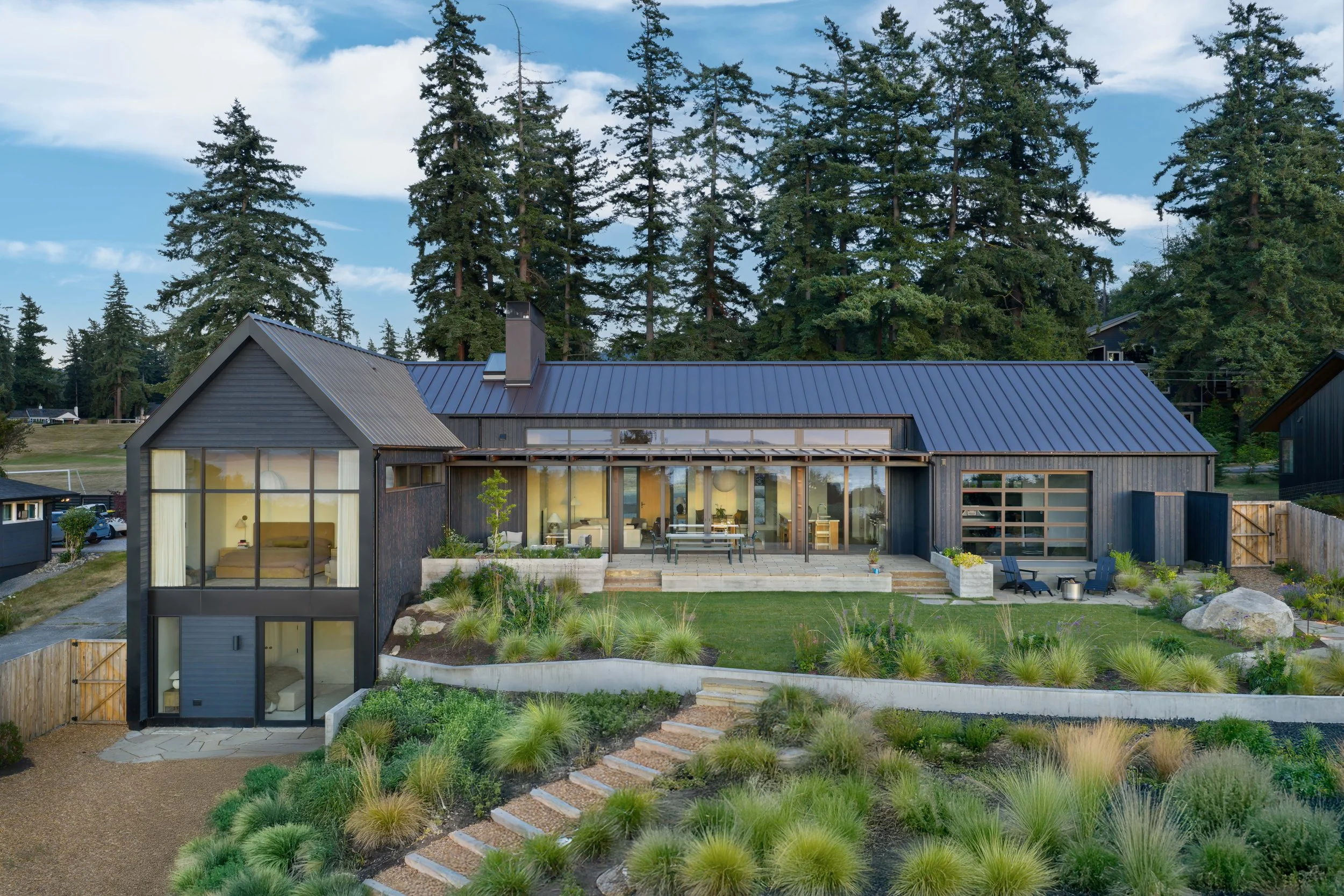 Atop a modest rise with sweeping views of Bellingham Bay, this ground-up home was designed for a young family with a deep connection to the outdoors and a passion for food. The clients purchased the site with a modest mid-century house and initially considered a remodel, but were instead able to move the original structure to a nearby lot, where it continues to serve as a home for a new owner. Their vision was to create a new family home anchored by a large kitchen and gathering space, emphasizing year-round indoor-outdoor connection, taking full advantage of the site’s westerly views, and offering flexibility to accommodate extended stays from family.