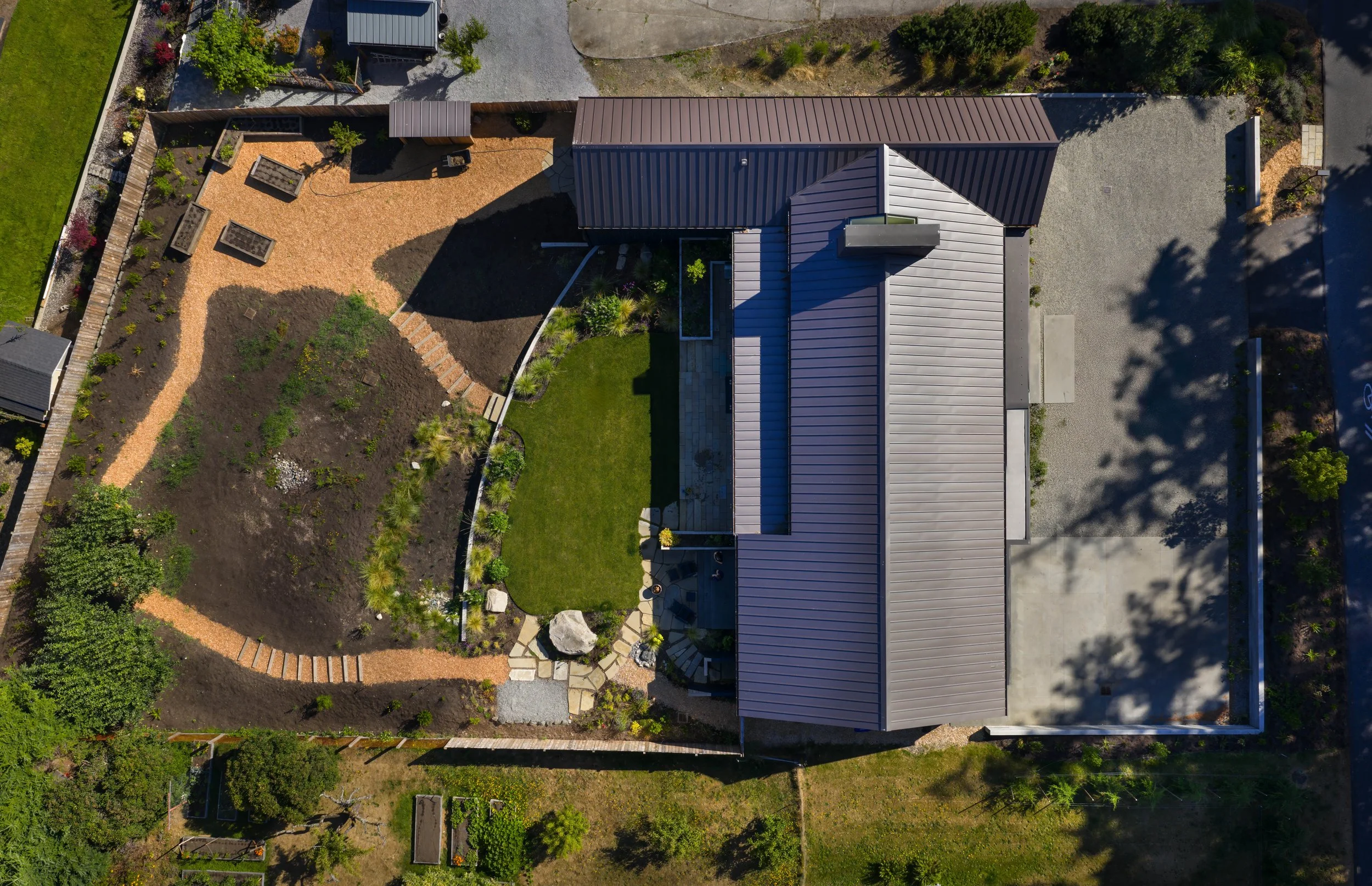 This commitment to performance extends beyond comfort and into long-term sustainability. Dense-pack cellulose insulation—made from recycled paper—fills most of the wall cavities, offering excellent thermal performance while sequestering carbon. The roof’s durable metal cladding has a lifespan of 70 years or more, and the natural wood siding is preserved using a traditional Japanese charring technique (shou sugi ban) that enhances resistance to pests, fire, and rot—without the use of chemical treatments. Below grade, continuous under-slab insulation helps reduce heat loss and support energy performance.