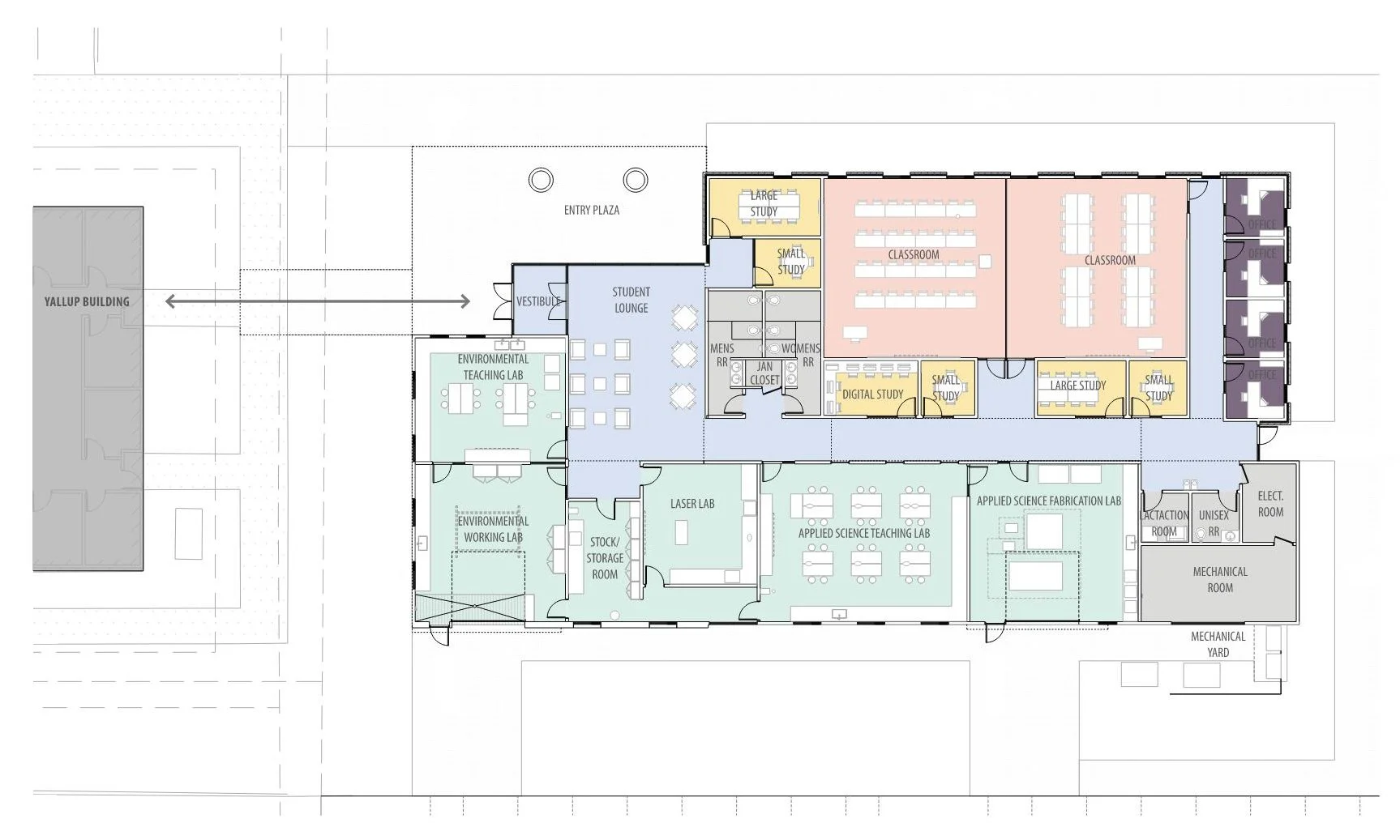 A new 10,000 square foot STEM Learning Center will serve the Pre-Engineering and Environmental Engineering programs and provide general use classrooms to the campus at large. The proposed project will have spaces, building systems and technological infrastructure appropriate for a contemporary instructional building. It will provide additional lab and classroom space for existing programs on campus and will follow the campus masterplan. It will enhance open space and provide a sense of connection to the existing Yallup building and with the surrounding campus environment.