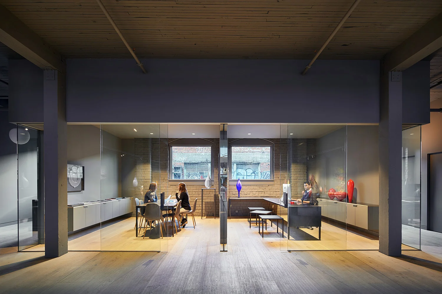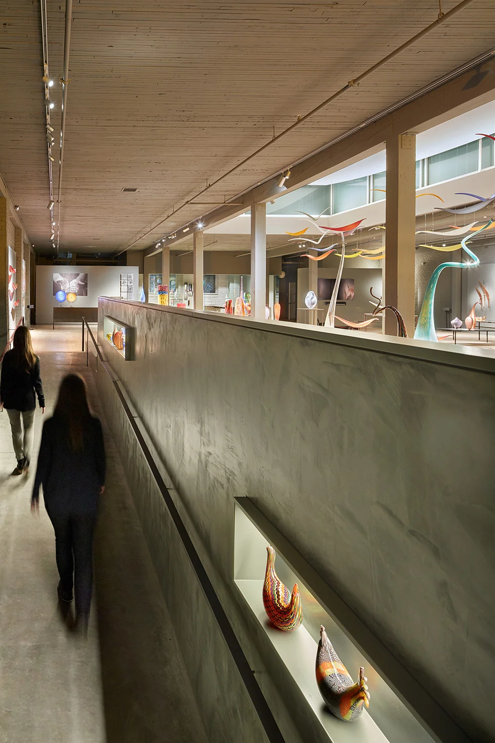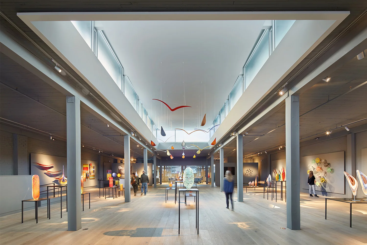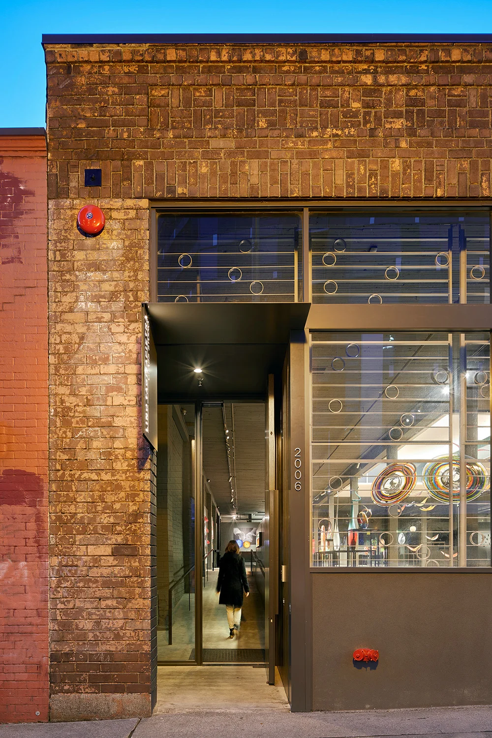 Most recently serving as home to an auction company, the studio occupies a 1917, one-story, masonry and heavy-timber-framed warehouse building, which presents a quiet presence to its urban setting. The entry is defined by a large wood-and-steel door which incorporates a modest illuminated cut-steel sign announcing the venue. Inside, the entry opens onto a sloping interior ramp which parallels the studio itself, which is essentially one large, 6,100-square-foot space. The brick interior has been painted matte gray, while floors are made with a subtly bleached white oak. Overhead, a 16-foot-wide-by-45-foot-long light monitor floats above the center of the space. Translucent clerestory glazing brings daylight into the space. The underside of the monitor features a curved soffit that softly shapes the daylight that fills the space. The client refers to the light-filled space created by the monitor as the cube. The cube serves as an illuminated volume in which to hang large collections of glass pieces or to feature tall works. Indirect light sources inset into the monitor provides dramatic lighting in the evening.