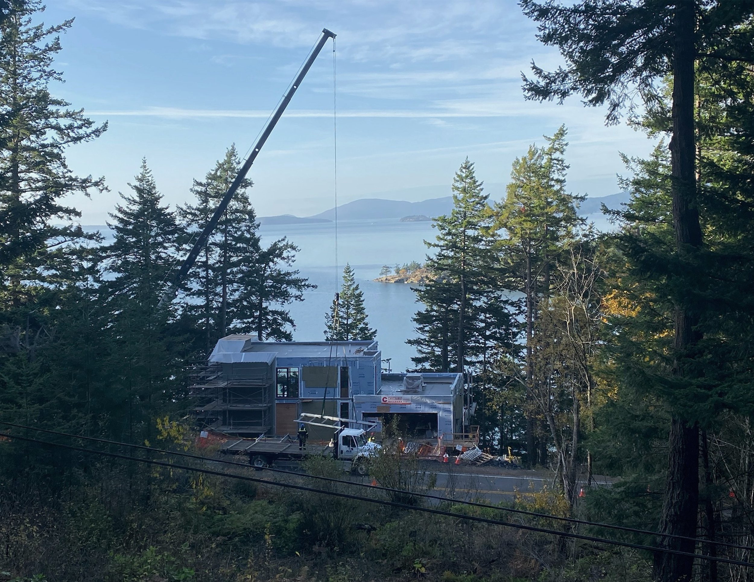 A compact design was dually needed to accommodate the challenging site and to create an efficient floor plan, both in resident use and energy performance. Durability and energy efficiency are important factors to the client and design team. The Teddy Bear Cove residence features enhanced building assemblies, high-performing windows, an HRV, an electric heat-pump air handler, and an electric heat pump water heater. Outside, the house balances a smooth grey plaster, warm cedar board, and a dark, durable richlite panel siding.